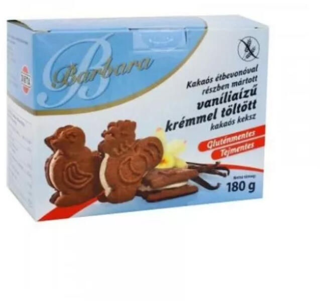 Barbara gluténmentes kakaós keksz vanília tölt. étbevonatos 150 g Összetevők : TÉSZTA: kukoricakeményítő, margarin [növényi zsírok (pálma), növényi olaj (repce), víz, emulgeálószerek: zsírsavak mono- és digliceridjei, napraforgólecitin, étkezési só, tartosító: szorbinsav, savszabályozó: citromsav, vajaroma, színezék: karotinok), kristálycukor, tojás, rizsliszt, ka