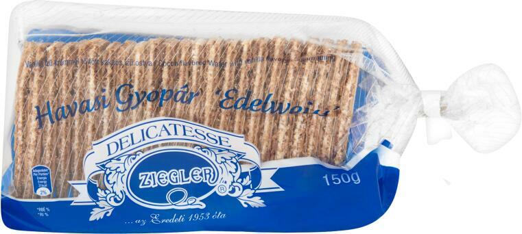 Vanília ízű krémmel töltött kakaós ostya. Eredeti, hagyományos finomság a Zieglertől. ermékleírásMárka információk ... az Eredeti 1953 óta Vanília ízű krémmel töltött kakaós ízű ostyaÖsszetevők Búzaliszt (34%), Cukor, Pálmazsír, Tejpor (zsíros), Zsírszegény kakaópor, Térfogatnövelőszer (nátrium-karbonátok), Tojáspor , Kristályvanillin A termék glutént, l