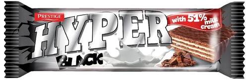 Hyper Black kakaós bevonatba mártott tejkrémmel töltött ostya 50g Hivatalos magyarországi forgalmazótól. Leírás: Nyomokban földimogyorót, szezámmagot és egyéb dióféléket tartalmazhat! Összetevők: Növényi zsírok (pálma, shea), emulgeálószerek (zsírsavak mono- és digliceridjei, szorbitán-trisztearát, szójalecitin), aroma, színezék (karotinok), cukor, búzaliszt, tejs