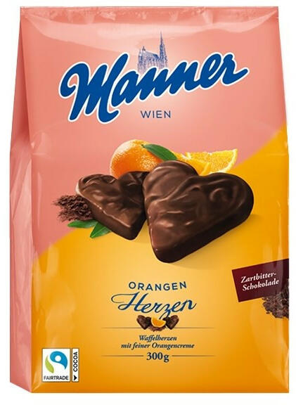 Töltött ostya MANNER szív narancsos 300g Töltött ostya MANNER szív narancsos Kiszerelés: 300g/csomag.