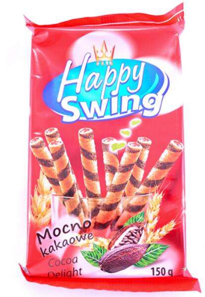 Happy swing kakaós ostyarúd 150g Hivatalos magyarországi forgalmazótól. Leírás: Kakaós krémmel töltött ostyarúd Összetevők: krém 54,5% [pálmazsír, sovány tejpor, tejsavó por, zsírszegény kakaópor 3,2%, kakaó rost 1,6%, hidrotermikusan kezelt búzaliszt, glükóz, aroma, étkezési só, emulgeálószer: lecitin (szójából)], ostya 45,5% [búzaliszt, cukor, glükóz sovány