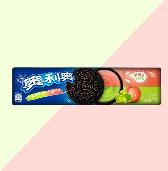 Oreo szőlő és őszibarack krémmel töltött keksz. töltőtömeg: 97g terméken a gyártási dátum szerepel. Minőségét megőrzi a gyártási időtől számított 12 hónapig Összetevők: búzaliszt, cukor, étkezési növényi olaj, kakaópor (hozzáadott mennyiség legalább 4,4%), keményítő, étkezési glükóz, élelmiszer-adalékanyagok (nátrium-hidrogén-karbonát, ammónium-hidr