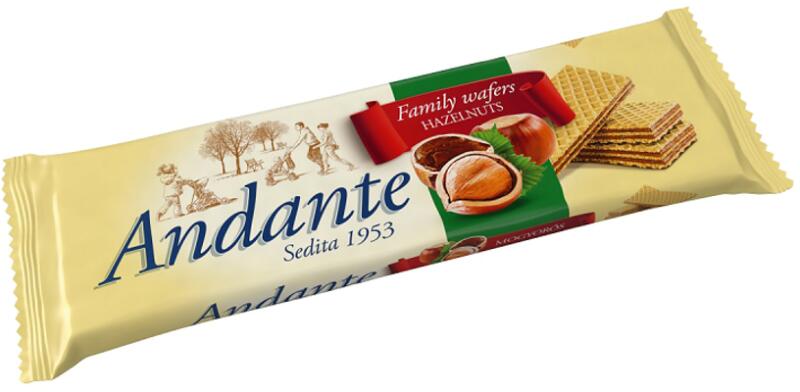 Andante mogyorós ostya 130g Hivatalos magyarországi forgalmazótól. Összetevők: Búzaliszt, Növényi zsírok: (pálmazsír, kókuszzsír), Cukor, Étkezési savópor, Sovány tejpor, Szójaliszt, Zsírszegény kakaópor, Dextróz, Emulgeálószer: (lecitinek), Napraforgó étolaj, Pörkölt mogyoró 0,7%, Kukoricakeményítő, Tojássárgája por, Térfogatnövelő szer: (nátrium-karbonáto