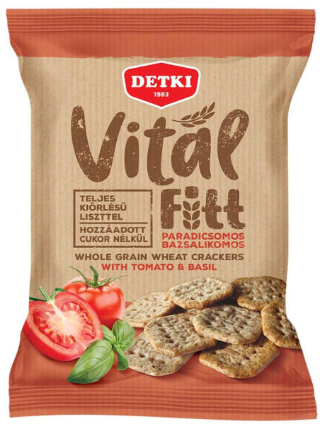 Detki vitál fitt teljeskiőrlésű kréker paradicsom-bazsalikom 100 g Bemutatkozik a Vitál Fitt! Az új sós, teljes kiőrlésű, hozzáadott cukor nélküli kréker a Detkitől. Te is vágytál már egy új, minőségi, sós és teljes kiőrlésű kekszre? Ha igen, akkor ezt mindenképp meg kell kóstolnod! 2022 nyarán került a boltok polcaira a Detki legújabb krékere, a Vitál Fitt, ami a