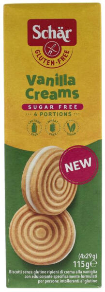 Schär gluténmentes cukormentes keksz vanília krémes 115 g Cukormentes, gluténmentes vanília krémes keksz. Összetevők: vanília krém 28% ( édesítőszer: maltitol, pálmaolaj, burgonyakeményítő, növényi rost (cikória inulin), kukoricakeményítő, természetes vanília aroma, napraforgó lecitin), rizsliszt, kukoricakeményítő, édesítőszer: maltitol, kukoricaliszt, pálmaolaj,