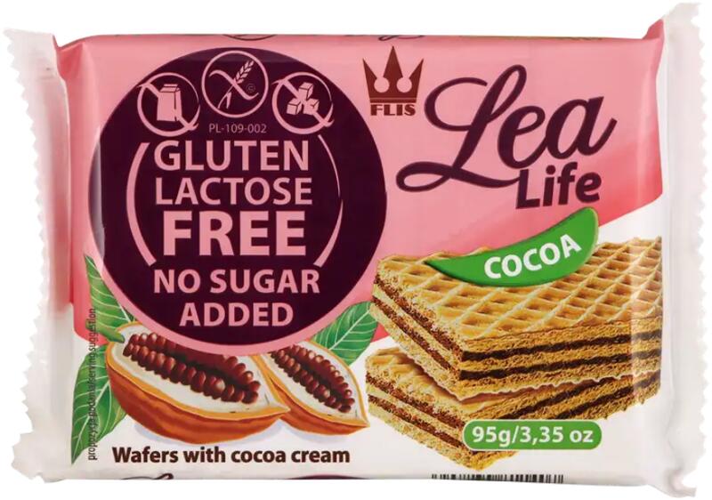 Lea Life kakós hozzáadott cukor-, glutén-, laktóz mentes ostya 95g Hivatalos magyarországi forgalmazótól. Leírás: Finom ropogós ostyalapok ami kakaó töltelékkel van töltve. Omlós, laktató, gyermekek különösen szeretik. Bármikor bárhol fogyasztható. Összetevők: kukoricakeményítő, pálmazsír, édesítőszer: maltitol E 965, tej laktózpor nélkül, természetes kakaópor