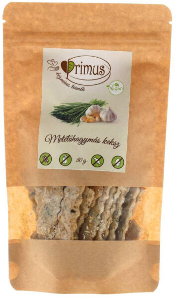 Primus vegán metélőhagymás keksz 80 g KÉZMŰVES Vegán Metélőhagymás keksz Csökkentett szénhidráttartalmú Összetevők : tápióka keményitő, mandula, kókuszkrém, kókuszolaj, kókuszőrlemény, száritott metélőhagyma, fokhagymapor, útifűmaghéj, só.