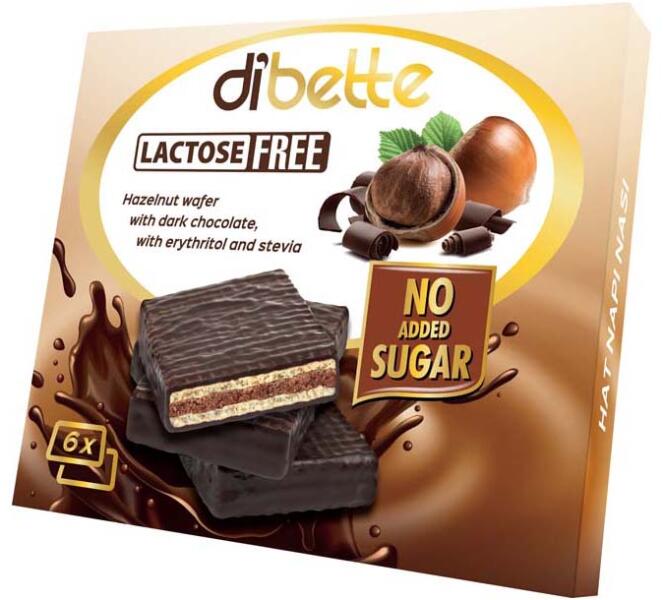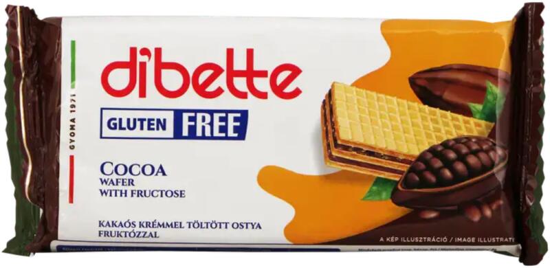 Dibette kakaós krémmel töltött ostya, fruktózzal gluténmentes 50 g Hivatalos magyarországi forgalmazótól. Leírás: Gluténmentes kakaós ostyaszelet Összete vők: kakaós krém 60% (részben hidrogénezett növényi zsír (pálma), fruktóz (14%), burgonya keményítő, zsírszegény kakaópor (9,5%), sovány tejpor, édes tejsavópor, aromák, emulgeálószer: napraforgó lecitin, osty