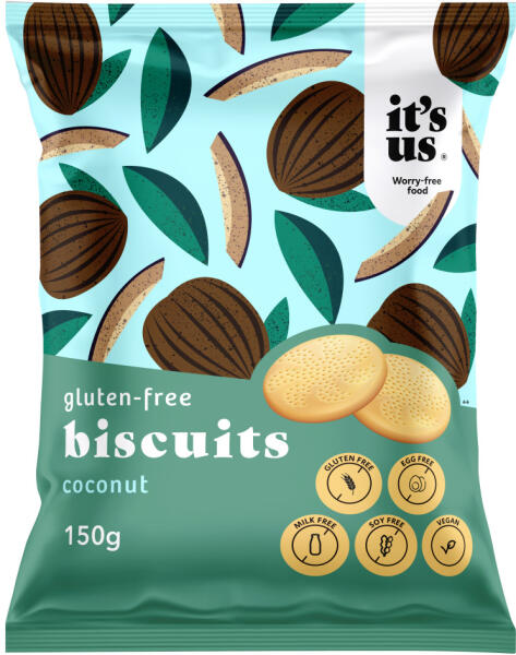 It`s us keksz kókuszos 150 g Gluténmentes, finom, omlós, kókuszos keksz. Összetevők: gluténmentes lisztkeverék cukor, rizsliszt, kukoricakeményítő, burgonyakeményítő, kukoricaliszt, kókuszreszelék 4,8 %, cirokliszt, tápióka keményítő, burgonyarost, térfogatnövelő szer (ammónium-hidrogén-karbonát), útifű maghéj rost, stabilizátor (guargumi), antioxidáns (aszkorbinsav