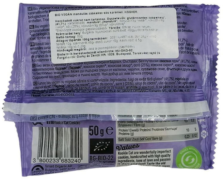 Összetevők: gluténmentes zabpehely* (41,7%), sós karamellizált mandula* (mandula*, kókusz szirup*, kókuszcukor*, só) (25%), kókusz szirup*, kókuszolaj*. *összetevők biogazdálkodásból