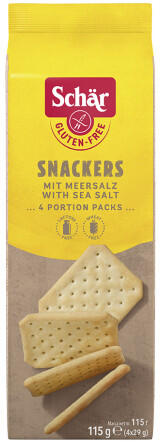Schär gluténmentes snackers 115 g Snackers sós kekszünk önmagában, de különféle mártogatósokkal feldobva is szuper harapnivaló. A csomagoláson belül 4 kisebb adagot találunk, így ha nem fogyasztjuk el rövid időn belül az egészet, a a maradék később is ugyanolyan friss lesz! Összetevők: Kukoricakeményítő, Kukoricaliszt, Növényi margarin [növényi olajok és zsírok v