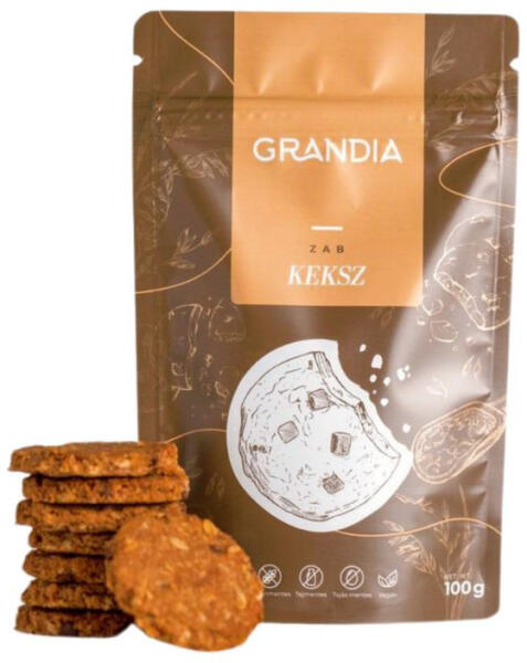 Grandia zabkeksz 100 g Összetevők: gluténmentes zabpehelyliszt, kókuszzsír, víz, gluténmentes zabpehely (10%), kókuszreszelék, étcsokoládé (cukor, kakaómassza, kakaóvaj, szőlőcukor, lecitinek – napraforgó), nádcukor, kókuszvirágcukor, térfogatnövelő szer: nátrium karbonát (szódabikarbóna), citromlé, só A termék nyomokban dióféléket tartalmazhat