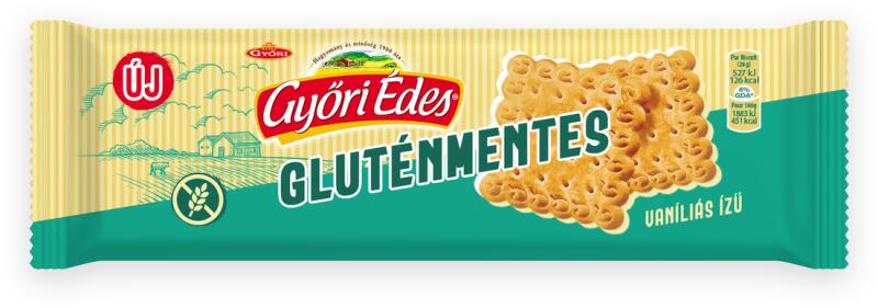 Győri Édes vaníliás ízű, gluténmentes keksz 75g Hivatalos magyarországi forgalmazótól. Leírás: Gluténérzékenyek is fogyaszthatják, Tartósítószer- és színezékmentes Összetevők: Kukoricakeményítő, Burgonyakeményítő, Cukor, Kukoricaliszt, Rizsliszt, Napraforgóolaj, Vaj, Tojáslé, Sovány tejpor, Tejsavópor, Emulgeálószer (E471), Térfogatnövelő szerek (ammónium-k