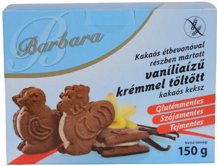 Gluténmentes vanília krémmel töltött kakaós keksz. Vanília krémmel töltött kakaós keksz. Száraz és hűvös helyen tárolandó.