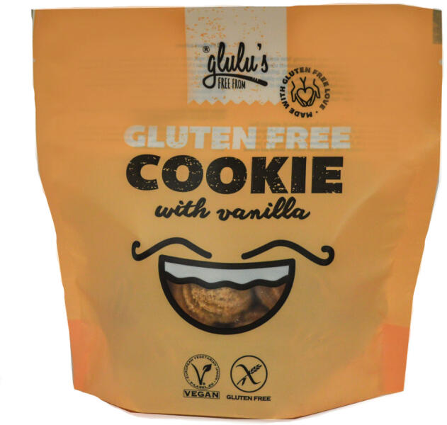 Glulu freefrom vaníliás keksz 100 g Glutén-, laktóz-, tej-, szója-, tojásmentes! Vaníliás, vegán édes süti. Összetevők: víz, cukor, barna rizsliszt, kókuszolaj, fehér rizsliszt, fehér rizsdara, gluténmentes zabliszt, sütőpor (térfogatnövelő szerek (nátrium-karbonátok, difoszfátok), kukoricakeményítő), útifűmaghéj, természetes vanília aroma 0,2% (aroma anyagok, pro