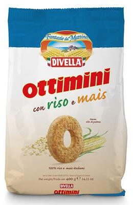 Olasz keksz rizses-kukoricás. A Bari közelében, az "olasz csizma" sarkánál lévő, 130 éves tapasztalattal rendelkező Divella gyár terméke. (400 g; 2975 Ft/kg) Összetevők: Búzaliszt, cukor, napraforgóolaj, friss tojás 10,5%, kukoricapehely 6% (kukoricaliszt 5,3%, cukor, árpamalátakivonat, só), puffasztott rizs 4,8% (puffasztott rizs 2,3%, cukor, glükózszirup, karamellizált cuko