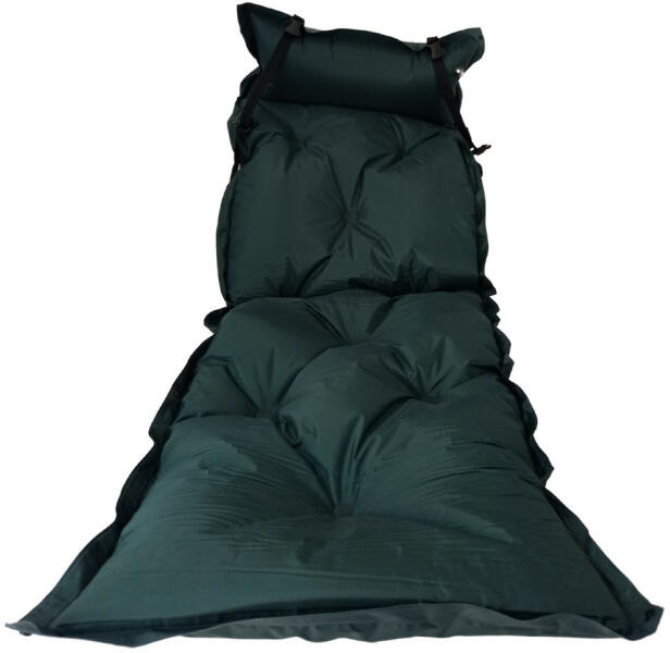 Szivacsos felfújható sportmatrac, külön felfújható fejpárnával. Horgászoknak, kirándulóknak, sátorozóknak tökéletes választás, nagyon kényelmes a szivacsos betét miatt, ezen kívül felfújható mind a fekvő, mind a párna része. Kis helyen elfér, könnyű hordozótáskával. Mérete: ~160x60 cm Összecsomagolt mérete:~50x10x10 cm Súlya: 1 kg
