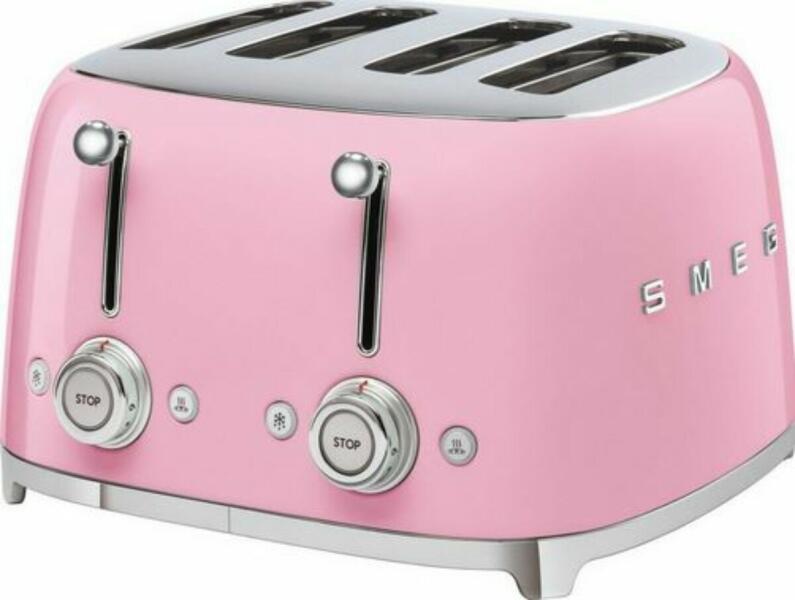 SMEG TSF03PKEU 2x2-szeletes kenyérpirító 50-es évek retro design 2000 W-os teljesítmény acél készülékház 4 db 36 mm széles nyílás (2-2 külön kapcsolható) 6 fokozat újramelegítő és kiolvasztó funkció Bagel funkció (egyoldali pirítás) megvilágított vezérlőgombok 2 morzsatálca csúszásmentes talp rózsaszín színben Termék mérete: 200 x 300 (320 a gömb fogantyúval