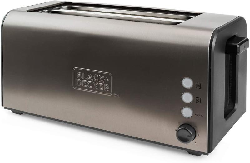 Black and Decker BXTO1500E Kenyérpirító (805001000561) Nagy teljesítmény: 1500 W a gyorsabb és egyenletesebb pirítás érdekében. 7 barnulásszabályozó beállítás. Pirítsa kenyerét ízlésének megfelelően. Stop funkció a fűtés azonnali leállításához, valamint kényelmes kiolvasztás és újramelegítés funkciók. 2 hosszú nyílással egyszerre 4 szelet kenyér pirítható.