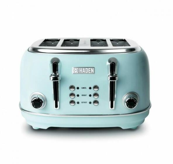 Brighten up your morning with this beautifully designed Turquoise Blue Heritage 4-Slice toaster. It features convenient cancel, toast, defrost and bagel button settings, a self-centering function to ensure your bread is perfectly toasted, and a removable crumb tray for easy cleaning. The browning control dial allows you to select the perfect timing for your bread, English muffin, or waffle. Toast