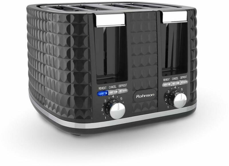 Kenyérpirító 4 szelet kenyérhez 1500 W teljesítménnyel. A Rohnson R-2630 hőszigetelt borítást, pirítási szint beállítást és kihúzható morzsatálcát kínál. Automatikus kiemelés, kikapcsolás és középre állítás.