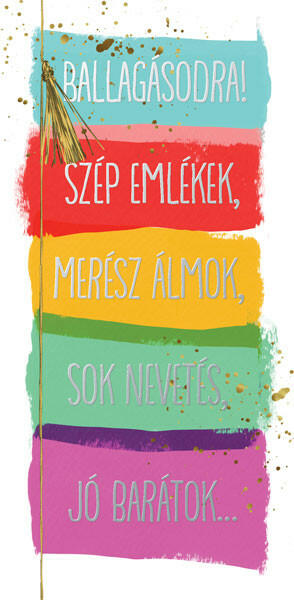 Ballagásra szánt pénz vagy utalvány átadásához használható zsebes borítékos lap . Elején arany metál fólia gratuláló felirattal, a zseben az alkalomhoz illő szép idézettel. Pasztell sárga színű, LA/4 méretű borítékkal. Hajtott lapméret: 108 x 216 mm