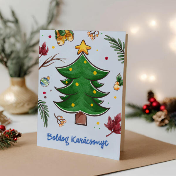 Karácsonyi üdvözlőlap egy szép festett karácsonyfa mintával, Boldog karácsonyt felirattal. Az üdvözlőlap belseje üres fehér, ide saját kézzel kell majd beírnod a jókívánságokat. Ha nem szeretnéd feladni, akkor ajándékkisérőnek is adható. Az üdvözlőlapon Boldog karácsonyt felirat szerepel, de kérésre bármilyen szöveget rá tudunk írni. Ezt kérlek jelezd a megrend