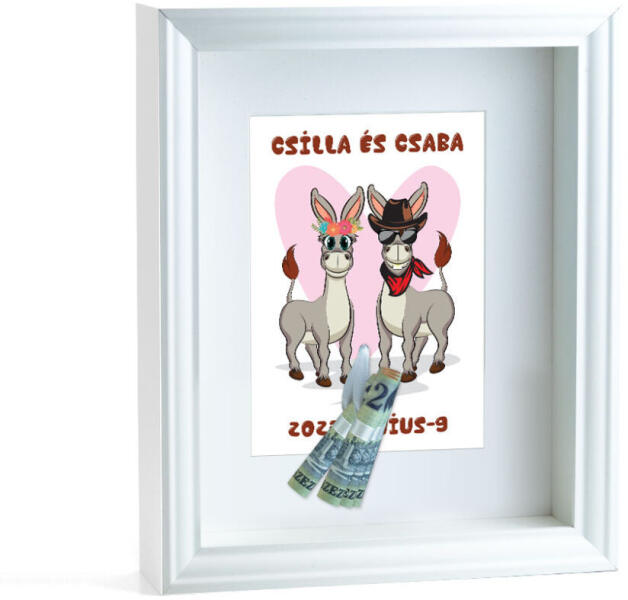 Egyszerű és igényes ajándék azok számára, akik nem csak egy szimpla pénzes borítékot szeretnének átadni nászajándék gyanánt az ifjú párnak. A képhez a menyasszony és a vőlegény nevét, valamint az esküvő dátumát tüntesd fel a megjegyzés rovatban. (akár dátum nélkül is kérhető!) Elkészítés ideje: 1 munkanap! Ha nincs ötleted, hogy hogyan adj igényesen és krea
