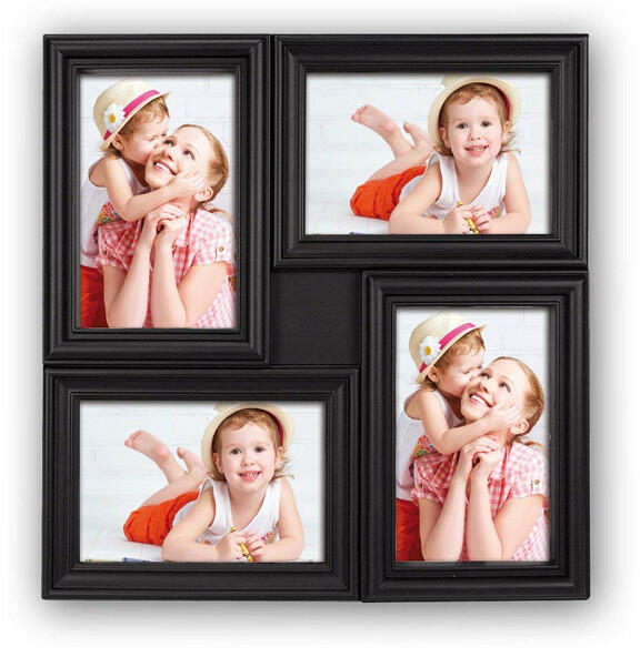 Fekete színű műanyag képkeret 2db álló, 2db fekvő 10*15 cm-es kép tehető bele Fekete színű műanyag képgaléria. 2db álló, 2db fekvő 10*15 cm-es kép tehető bele.