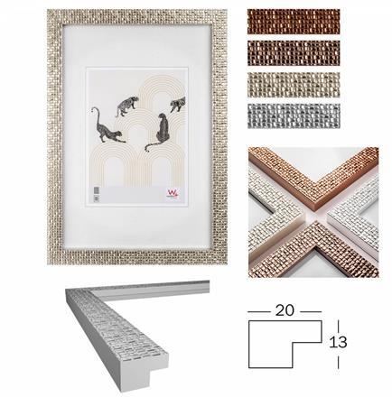 Fa keret Antik hatású színezéssel 10x15 cm-es képhez Ezüst szín A keret 10x15 cm-es képhez készült. Antik hatású színezéssel, barokk mintával. Hátlapja farostlemez, kitámasztóval, forgó kapcsokkal. Álló és fekvő helyzetben is használható. Ezüst színben.