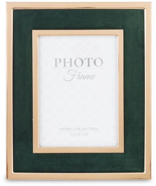 Műanyag keret 18x24 cm-es képhez Paszpartuval 13x18 cm-es képhez Sötétzöld szín A keret 18x24 cm-es képhez készült. Vékony, gömbölyű léccel, fémes hatású festéssel. Közepén perforációval, melyet kiemelve a megmaradt rész paszpartuként használható. Hátlapja farostlemez, kitámasztóval. Fektethető és állítható, valamint akasztható elrendezéssel. Sötétzöld szín