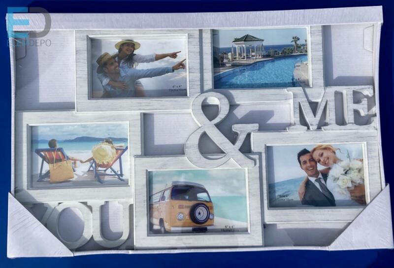 Osztott képkeret 5 képpel 5 db 10 x 15cm képnek színe. fehér koptatott mérete: 53cm x 34cm x 3cm Könnyen szerelhető, gyorsan, egyszerűen lehet képet cserélni. anyaga. műanyag Osztott képkeret 5 képpel " You & Me "