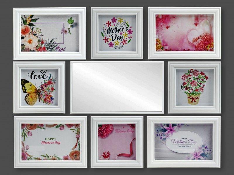 Fali fényképtartó szett 23,5x13cm-es tükörrel 4db 15x10cm-es és 4db 10x10-es képhez 03632 - Fényképtartó Befoglaló méretek 51x2x41 cmAnyaga műanyag, üveg