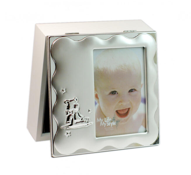 Termék jellemzői: Többfunkciós tároló doboz kisbabák részére, tetején fényképtartóval, macis mintával. Lézeresen gravírozzuk, kitöltött betűkkel. A gravírozás színe fém színű lesz. K artondobozba csomagolva szállítjuk. Gravírozási technika : Lézeres (kitöltött) Méret:160x160mm Kompatibilis képméretek:9x13cm-es képhez Anyaga : Fa, fémlemez és bársony