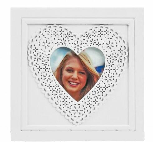 Fényképtartó szíves fehér 9x9cm-es képhez 3460 - Fényképtartó Képkeret szíves fehérBefoglaló méretek 18x1.5x18 cmAnyaga fa, üveg