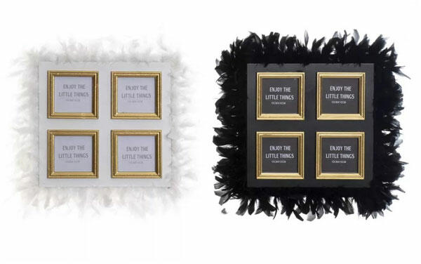 4 részes fali képkeret, ami egyben különleges fali dekoráció is arany fényképkeretekkel, melyet pihe puha tollak vesznek körbe. A tollas képkeret 2 féle színben kapható, fekete és fehér. Mérete: 45x45cm