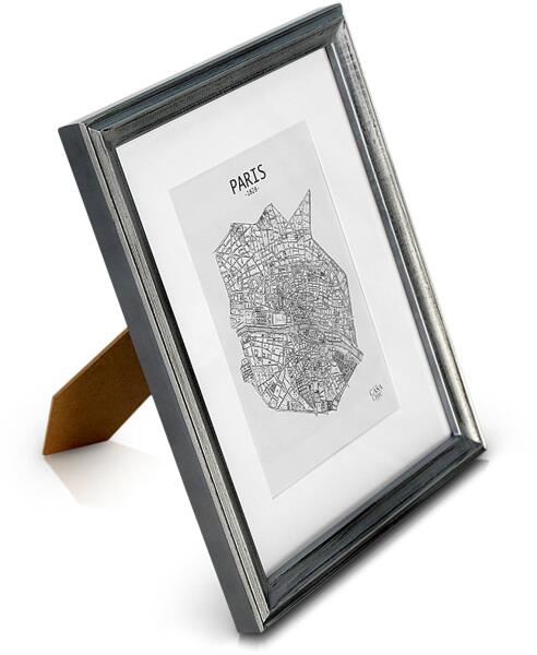 Fa képkeret 30x40 cm-es képhez Ezüst szín A keret 30x40 cm-es képhez készült. 1,4 cm-es fa léccel, matt festéssel. Közepén perforációval, melyet kiemelve a megmaradt rész paszpartuként használható. MDF hátlappal, kitámasztóval. Felfüggesztést és kép elhelyezést elforgatható bilincsek segítik. Fekvő és álló helyzetben is akasztható. Ezüst színben.
