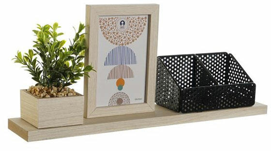 Fából készült, fényképtartó, üveg előlappal és kaspós zöld színű műnövényekkel, 2 részes fekete fém rendszerezővel. A fotótartó mérete: 43x8x19cm