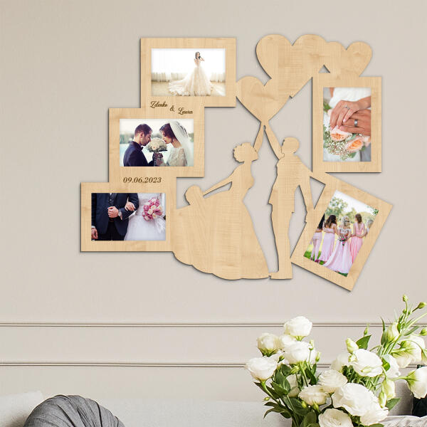 Minden otthon népszerű kiegészítője egy stílusos esküvői képkeret. Készítsen mozaikot az esküvői képeiből. Ideális ajándék friss házasoknak, évfordulóra vagy Valentin-napra. A képkeretek és figurák faforgácslapból készülnek, és 3 mm vastagságuknak köszönhetően 3D hatást keltenek, a képeket egyszerűen beillesztheti, és az egész dekorációt a falra helyezheti a