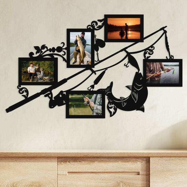 A falra ragasztható kollázs képkeret egyedi ajándék egy szenvedélyes horgásznak. Készítsen emléket a legjobb fogásokról készült fényképekből, egy díszes horgászbot és orsó, valamint egy frissen fogott hal mellett. A fakeret alkalmas a konyhába, a nappaliba vagy az előszobába, és garantáltan örömet okoz a kis és nagy horgászoknak egyaránt. Egyszerű kialakításának