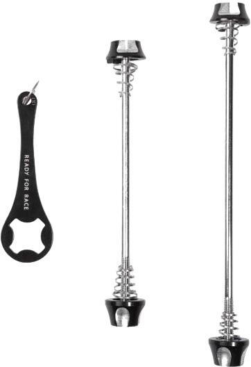Biztonsági gyorszár szett kerékpárhoz. 135/145 mm hátsó kerékhez; 100/110 mm első kerékhez. CrMo acél anyagból. Súly: 70 g. Könnyen szerelhető.