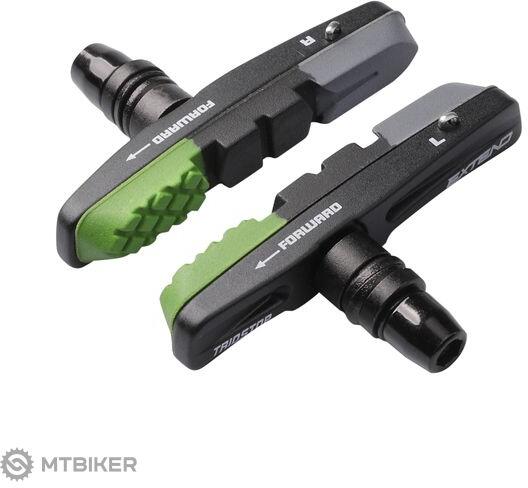 72 mm-es aszimmetrikus fékblokkok cserélhető 3-komponensű gumikkal és imbuszanyával, MTB és Cross/Trekking V-fékekhez . Három vegyület és az érintkezési felületek speciális kialakítása a gumikon fokozza a fékező hatást nedves felületen és csökkenti a fékezés közbeni zajt (szürke keverék) - Anti Squeal funkció . Speciálisan kifejlesztett barázdált forma (zöld kever