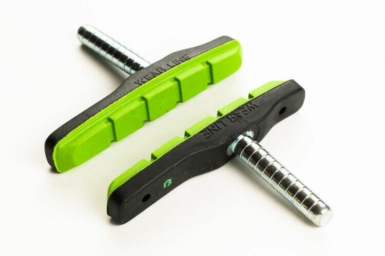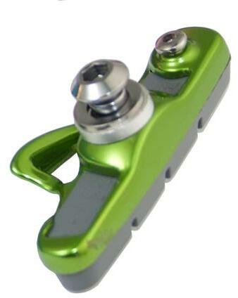 Shimano kompatibilis cserélhető betétek, 55 mm. Extra könnyű, eloxált alumínium fékpofa ház. Rozsdamentes rögzítő csavarok. Általános időjárási körülményekre. Tömeg: 34 g. A közölt termékfotók eltérnek a valós színektől, a fékbetétek feketék. Szín : zöld-fehér Kiszerelés : 2 kerékhez Fékfelület anyaga : alumínium Fékpofa rögzítése : Imbuszos