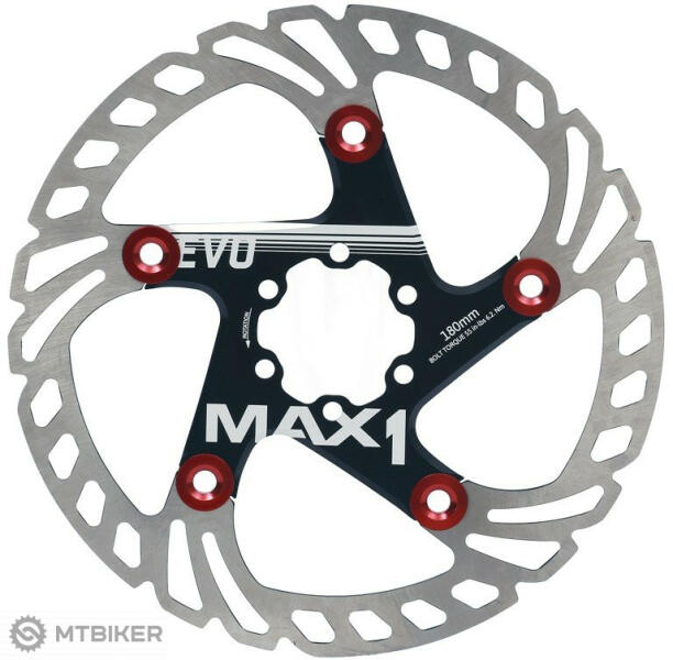 Féktárcsa MAX1 EVO 180mm alumínium tartóval. A tárcsa rendkívül hőálló 410 rozsdamentes acélból, a meghajtó AL7075 alumíniumötvözetből készült. Felületkezelés 42HRC. A féktárcsa formája nagyon jó hűtést biztosít Ultrakönnyű kivitel Nagy hatékonyság minden körülmények között Kiváló méretstabilitás az Alu tartószerkezetnek köszönhetően Súly: 150 g A csom