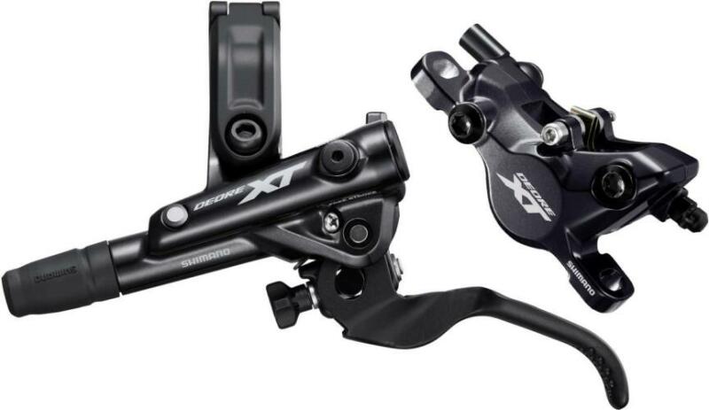 Shimano Deore XT BR-M8100 és BL-M8100 hidraulikus tárcsafék szett, első, 1000 mm, fekete XC, MTB felhasználásra szánt fék szett Fékfolyadékkal feltöltött, előszerelt kialakítás (esetleges méretre vágás után a fékkart még össze kell szerelni a fékcsővel) 1000 mm hosszú vezetékkel. Hűtőbordás fékbetét kompatibilitás (hűtőborda nélküli betéttel) Zsanéros, I-SPEC