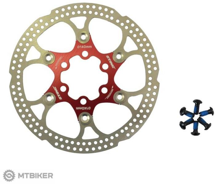 Kéttónusú féktárcsa lebegő középponttal. Műszaki megnevezés: ST-140 Szerelés: 6 lyuk Piros szín Átmérő: 140 mm Hűtés: duralumínium úszó központ Anyaga: rozsdamentes acél / lebegő duralumínium központ A csomag tartalma: tárcsa, csavarok Súly: 87 g