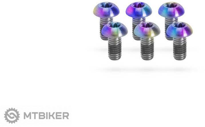 A Kogel Bearings titán csavarja helyettesíti a szokásos acélcsavarokat. A megtakarított súly mellett a csavarok színes megjelenésükkel is pontot tesznek. 10 mm-es hosszukkal minden típusú hatcsavaros tárcsához alkalmasak. A készlet 6x M5x10 T25 csavart tartalmaz. Előnye a hosszú élettartam, a korrózióállóság és a kis tömeg. Műszaki specifikáció: Anyaga: Ti-3Al-2V titán