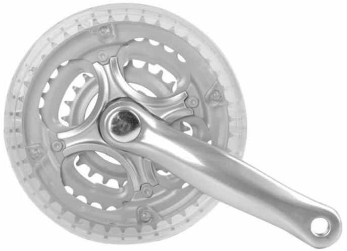 Csepel négyszögtengelyes MTB hajtómű 24-34-42T, 165 mm, LV, alu, ezüst színű Hobbi négyszögtengelyes hajtőmű MTB kerékpárokra, nadrágszár védővel. Négyszögtengelyes tengelyrögzítés 165 mm-es alu hajtókarok, szegecselt acél lánckerekekkel (nem bontható) 3 x 6-7-8 sebességes rendszerekkel kompatibilis Acél lánckerekek Fogszám kiosztás: 24-34-42 fog LV: átlátszó nadr