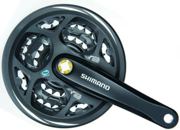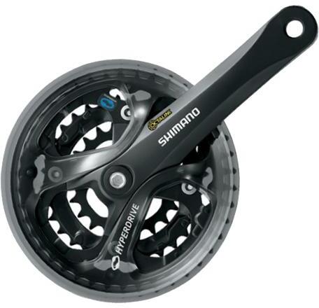 Shimano Tourney FC-TY301 négyszögtengelyes MTB hajtómű 24-34-42T, 175 mm, alumínium, LV, fekete, doboz nélkül FC-TY301 belépő kategóriás négyszögtengelyes hajtómű MTB kerékpárokra, nadrágszár védővel. Négyszögtengelyes tengelyrögzítés 175 mm-es alu hajtókar, szegecselt acél lánckerekekkel (nem bontható) 3 x 6-7-8 sebességes rendszerekkel kompatibilis Acél lánckerek