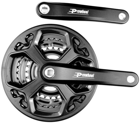 Prowheel Ty-CQ02 négyszögtengelyes trekking hajtómű, 28-38-48T, 170 mm, alumínium, fekete Négyszögtengelyes hajtómű belépő szintű trekking bicajokra Négyszög tengelyrögzítés Hidegen kovácsolt kar 6-7-8 sebességes rendszerekkel kompatibilis Acél lánckerekek, szegecselt rögzítéssel (nem bontható) Fogszám kiosztás: 28-38-48 fog Nadrágszárvédővel A középrész nem jár